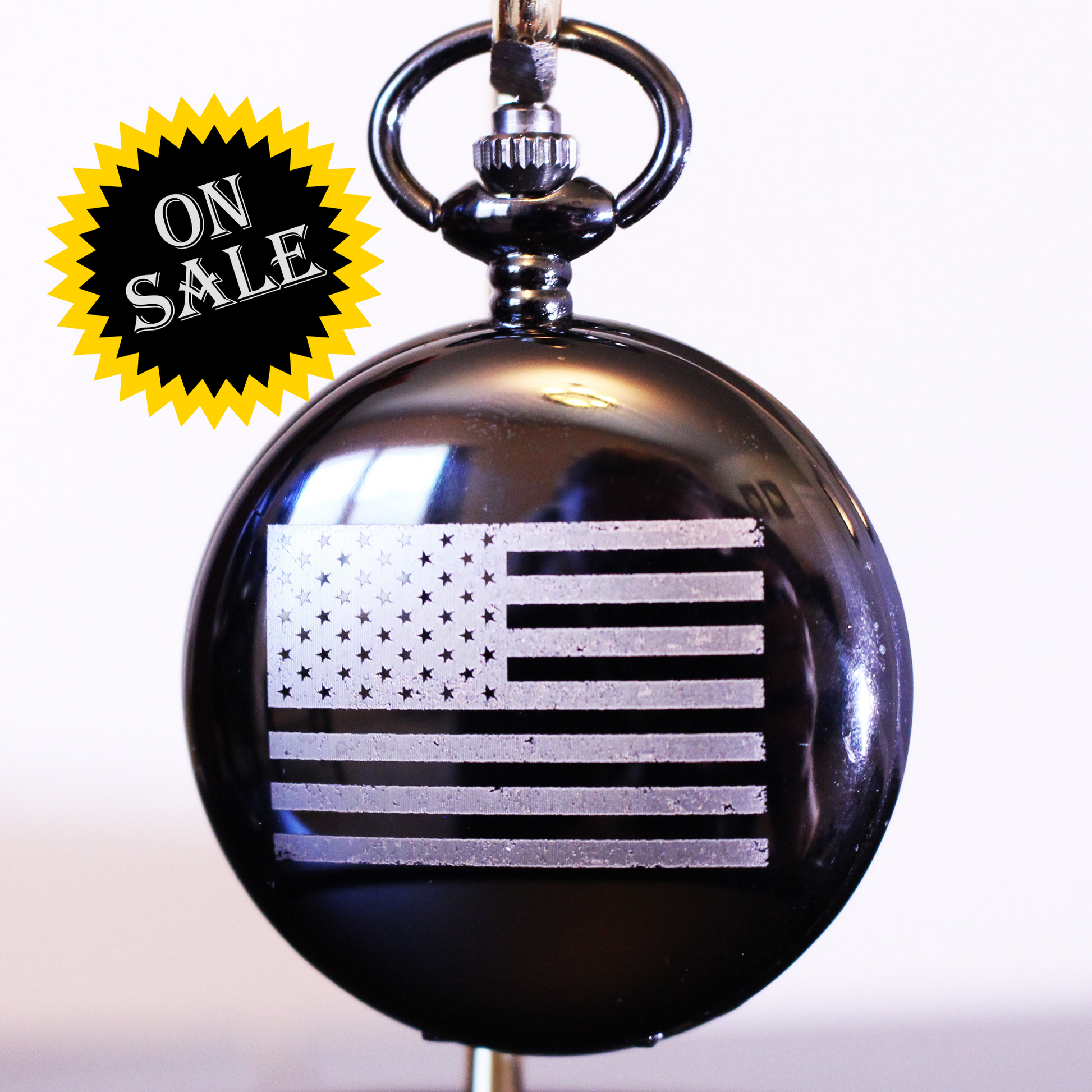 Show your Patriotism with this Brass laser engraved custom American Flag Pocket Watch. The tattered stars and stripes us a custom image designed to inspire. Perfect for your next event. Pocket watch chain is included with purchase.